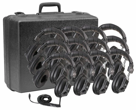 - Foam-lined carrying case stores twelve headphones and is ideal for itinerant teachers, mobile AV carts, computer labs