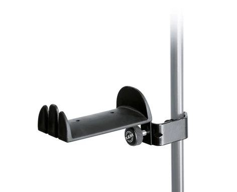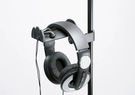 A holder for headphones when not in use. The new headphone holder is simply clamped to the tubes of a music or microphone stand, etc. and is generally for a tube diameter max of 30mm. The soft rubber support can easily take two sets of headphones. In addition, 2 in-ear headphones can also be hung on the slotted front of the holder. The headphones are close to hand and out of the way.